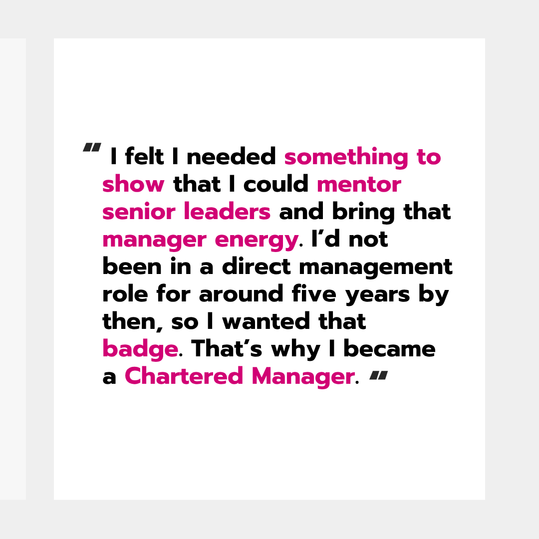 “I have training and coaching qualifications but I also felt I needed something to show that I could mentor senior leaders and bring that manager energy. I’d not been in a direct management role for around five years by then so I wanted that badge.”